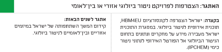 במסגרת פעילותה של ישראל בקונסורציום HBM4EU מתקיים שיתוף מידע על מחקרים שנערכים ועל נתונים שנאספים בניטור ביולוגי בישראל. בין היתר הועברו נתונים על חשיפה של נשים לביספנול A (bisphenol A – BPA). הנתונים שימשו למטא-אנליזה על גורמי חשיפה לביספנולים בקרב נשים באירופה. כמו כן, מידע על שישה מחקרי ניטור ביולוגי מישראל הועלה אל הפורטל האירופי לנתוני ניטור כימי (International Platform for Chemical Monitoring – IPCHEM), בהם סקרים של משרד הבריאות ומחקרי עוקבות לידה.1 ישראל שותפה גם בדיונים על קידום קיימוּת של ניטור ביולוגי באירופה, ובכלל זה דיונים על שימוש בנתוני ניטור ביולוגי בהערכות סיכונים וקידום מדיניות בתחום בריאות וסביבה.