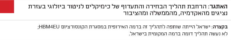 במסגרת התוכנית הלאומית לניטור ביולוגי בישראל גובשה תוכנית להצגת הבחירה והתעדוף של כימיקלים לניטור ביולוגי לנציגים מהאקדמיה, מהממשלה ומהציבור, כדי לשפר את שקיפות התהליך. עם זאת, יש צורך לבצע הערכה תקופתית של התעדוף ולבחון הכללה של מזהמים נוספים, כגון מעכבי בעירה מסוג זרחנים אורגניים וכן תרכובות פרפלואורואלקיליות ופוליפלואורואלקיליות.