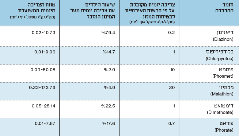 בהתבסס על נתונים של ריכוזי תוצרי הפירוק של זרחנים אורגניים בדגימות שתן של 103 ילדים, שנאספו במסגרת סקר רב מב"ת 2016-2015, חישבו חוקרים ממשרד הבריאות את טווח הצריכה היומית המשוערת (estimated daily intake – EDI) של חומרי הדברה מסוג זרחנים אורגניים בקרב הילדים. הם השוו את ערך הצריכה המשוערת לערך הצריכה המקובלת (acceptable daily intake – ADI) – ערך המבטא את רמת החשיפה אשר מתחתיה לא צפויה השפעה שלילית על הבריאות, כפי שקבעה הרשות האירופית לבטיחות המזון (European Food Safety Authority – EFSA). לפי חישוב זה אפשר לראות שכ-15% מהילדים נחשפו לחומר ההדברה כלורפיריפוס במינון העולה על המינון הנסבל (לוח 3).2
