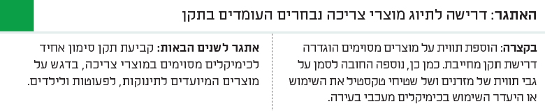 משרד הכלכלה והתעשייה השיק אתר אינטרנט ("הפורטל הישראלי לבטיחות מוצרי צריכה"), ובו מידע על מוצרי צריכה אשר הגיעו לשווקים בישראל, נמצאו לא מתאימים והוסרו מהמדפים ("ריקול").5 למרות השיפור עדיין לא מתפרסמים נתונים תקופתיים על היקף הבדיקות המבוצעות ותוצאותיהן.