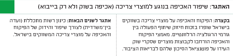 הקמת ועדה בין-משרדית אשר תקבע תוכניות עבודה שנתיות ויעדים תוכל לטייב את הפיקוח ואת האכיפה ולהפנות את המשאבים המוגבלים למוצרים שפוטנציאל הסיכון שלהם לבריאות הציבור גבוה יותר.