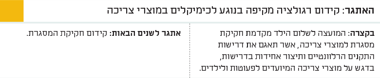 לנוכח הרגישות המיוחדת של אוכלוסיות מסוימות לכימיקלים, הוחלט במועצה לשלום הילד ובקרן לבריאות וסביבה למקד את המאמצים במוצרי צריכה המיועדים לתינוקות, לפעוטות ולילדים. גופים אלו ניסחו חקיקת מסגרת להגבלת כימיקלים במוצרי צריכה המיועדים לאוכלוסייה זו.