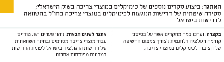 בישראל אין עדיין מסגרת רגולטורית לבחינה שיטתית של כימיקלים ורישומם אף שמסגרת כזאת קיימת בכל מדינות הארגון לשיתוף פעולה ולפיתוח כלכלי (Organisation for Economic Co-operation and Development – OECD) למעט טורקייה. נוסף על כך, שלא כבארצות הברית ובאירופה, בישראל אין מסגרת רגולטורית מקיפה עבור מוצרי צריכה.6