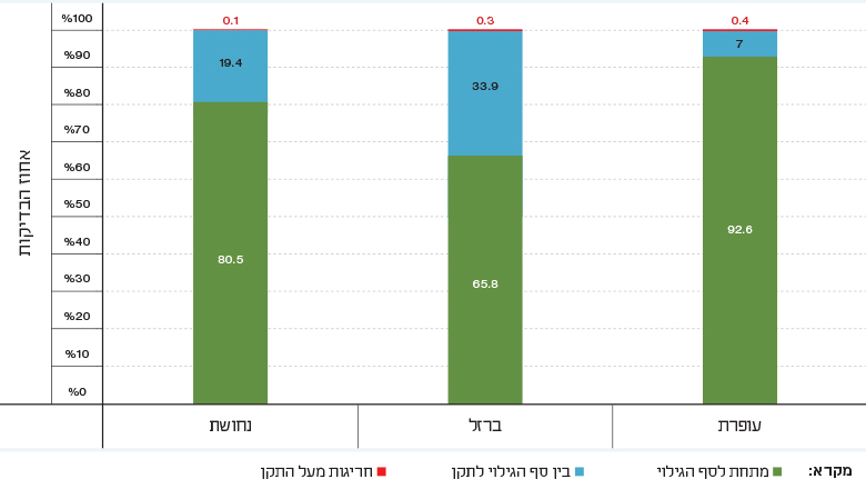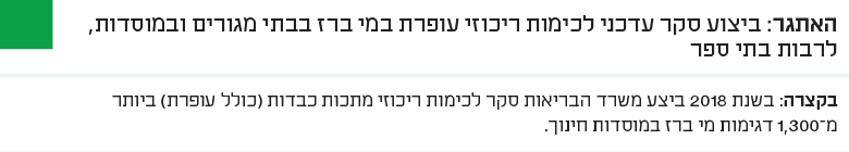 במהלך 2018 יזם משרד הבריאות סקר לכימות ריכוזי מתכות כבדות במי ברז במוסדות חינוך ברחבי הארץ. בסקר נבדקו 1,379 דגימות מי ברז במוסדות חינוך ברחבי הארץ – בערים גדולות וביישובים קטנים, במרכז ובפריפריה. דגימות מי הברז נבדקו למתכות כבדות: עופרת, ברזל ונחושת. בסקר נמצא ש-99.6% מהדגימות היו תקינות מבחינת ריכוזי העופרת, 99.7% מהדגימות היו תקינות מבחינת ריכוזי הברזל, ו-99.9% מהדגימות היו תקינות מבחינת ריכוזי הנחושת (תרשים 1).2