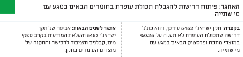 בעקבות עבודה משותפת של משרד הבריאות ומשרד הכלכלה והתעשייה עודכן תקן ישראלי 5452 למוצרי מתכת ופלסטיק הבאים במגע עם מי שתייה, והוספו בו דרישות להגביל בהם את תכולת העופרת כך שלא תעלה על 0.25% מתכולת המוצר. דרישה זו אומצה בהשפעת החוק האמריקני להפחתת עופרת במי שתייה (Reduction of Lead in Drinking Water Act, 2011). הדרישה הנוגעת למוצרי פלסטיק נכנסה לתוקף במרץ 2018, והדרישה הנוגעת למוצרי מתכת נכנסה לתוקף במרץ 2020.
