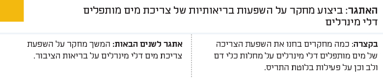 - כמה מחקרים, שהוזכרו לעיל, בחנו את ההשפעות של צריכת מי שתייה מותפלים שבהם תכולת מינרלים נמוכה על הבריאות. נבחנה ההשפעה על שיעורי התחלואה במחלות לב, בסוכרת וברמות כולסטרול גבוהות5 וכן על תת-פעילות בלוטת התריס.7 עוד נבחן הקשר בין צריכת מי שתייה מותפלים לריכוזי יוד, לתפקוד בלוטת התריס,8 לרמת המגנזיום בדם, להורמוני בלוטת התריס ולשימוש בתרופות למחלות לב.6