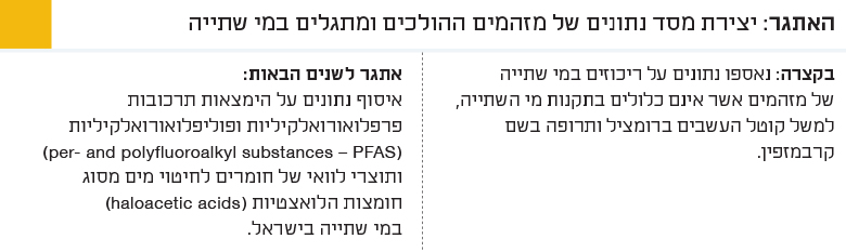המעבדה הארצית לבריאות הציבור של משרד הבריאות ומעבדות אחרות (למשל, של חברת מקורות) מיישמות טכנולוגיות אנליטיות חדישות לבדיקות מים, המאפשרות לגלות חומרים כימיים שאינם נכללים בתקנות מי השתייה. הנתונים שאוספות המעבדות משמשים את משרד הבריאות ליצירת מסד נתונים על מזהמים במי שתייה. איסוף נתונים על חומרים כימיים שאינם נכללים בתקנות המים כולל איסוף מידע על מיקרו-מזהמים אורגניים נדיפים ונדיפים למחצה ממקורות זיהום שונים וסריקה של כלל המתכות במערכות האספקה. נתונים אלו משמשים כלי תומך החלטה בפעילויות רגולטוריות.