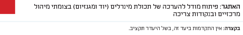 העבודה התאורטית לקראת עריכת מחקר חלוץ על ישימות הוספת מגנזיום למים מותפלים הושלמה ב-2020, והמחקר היישומי באתר התפלה מתוכנן ל-2021. אתגר לשנים הקרובות הוא מעקב אחרי ממצאי מחקר החלוץ ותרגומם למדיניות – דרישה להוספת מגנזיום בהתאם לרמה המיטבית של מגנזיום במי השתייה. לאור העלייה המהירה בצריכת מים מותפלים דלי מינרלים, יש צורך לבחון צריכה של מיקרונוטריאנטים בציבור בישראל, ובכלל זה יוד, מגנזיום ופלואוריד, באמצעות שימוש בסמנים ביולוגיים תזונתיים. יש צורך לבחון גם את ההשפעה של שימוש במים דלי מינרלים בחקלאות על הערך התזונתי של גידולים חקלאיים.