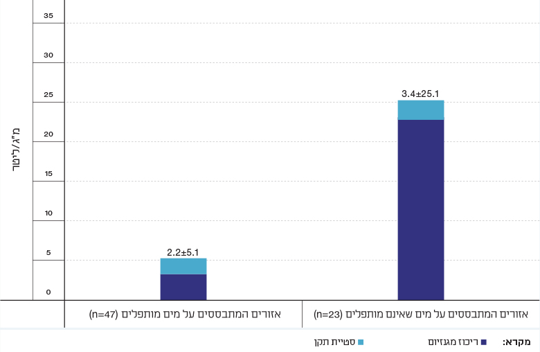 חוקרים מאוניברסיטת בר-אילן ומהמרכז הרפואי ע"ש חיים שיבא – תל השומר בדקו ריכוזים של מגנזיום במי ברז וכן בדגימות דם של 380 חולים שאושפזו בשל אוטם שריר הלב בשנים 2017-2015, וביצעו מעקב אחר תחלואה ותמותה במשך שנה. באזורים אשר חלק גדול מאספקת המים בהם מבוסס על מים מותפלים נמצאו ריכוזים נמוכים של מגנזיום במי ברז וכן בדמם של חולים, ואילו באזורים המתבססים על מי תהום או על מים עיליים נמצאו ריכוזים גבוהים יותר של מגנזיום (תרשים 2). בקרב החולים הגרים באזורים שחלק גדול מאספקת המים בהם מבוסס על מים מותפלים נמצאה, לאחר שנת מחקר, עלייה לא מובהקת הן בסיכון לאירועים לבביים משמעותיים הן בתמותה.4