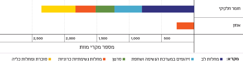 על פי נתונים מ"נטל התחלואה העולמי", עיקר נטל התחלואה מזיהום אוויר חלקיקי בישראל מתבטא במחלות לב, ועיקר נטל התחלואה מאוזון מתבטא במחלות נשימתיות (תרשים 2).4