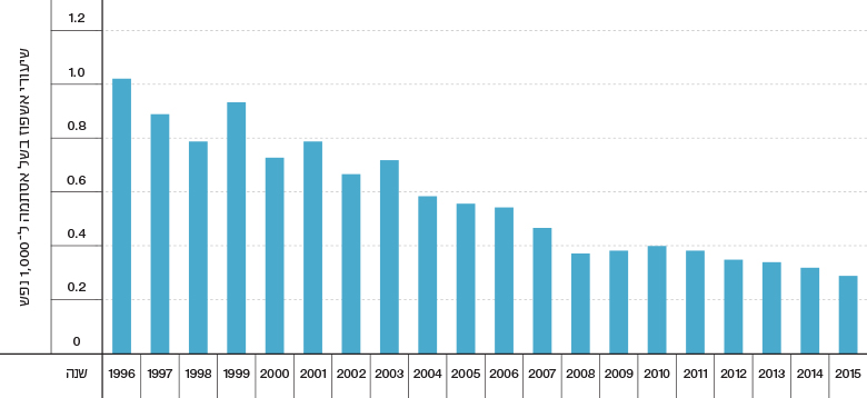 תרשים 4: מגמות בשיעורי אשפוז בשל אסתמה בישראל בקרב ילדים בני 14-5 בשנים 2015-1996