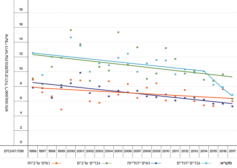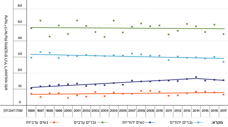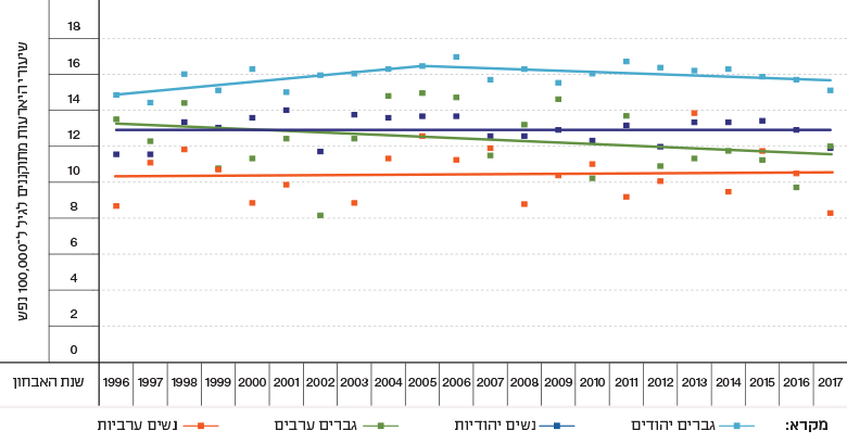 תרשים 5: מגמות בשיעורי היארעות של סוגי סרטן נבחרים לפי מין וקבוצת אוכלוסייה, ישראל, 2017-1996