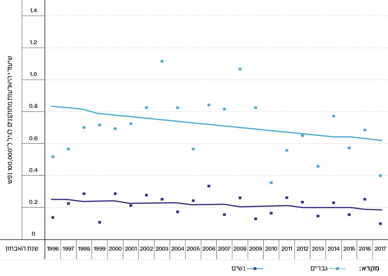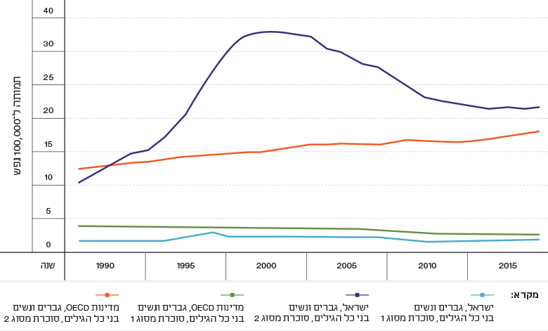 על פי דוח התוכנית הלאומית למדדי איכות לרפואת הקהילה בישראל, בשנים 2018-2014 שיעור הימצאות סוכרת בקרב בני 17-2 נמצא יציב (0.1%).6 אשר לנתוני תחלואה ותמותה בסוכרת בשנים 2017-1990, נמצא כי יש מגמה של ירידה בתחלואה ובתמותה עקב סוכרת מסוג 1, הן בישראל הן במדינות הארגון לשיתוף פעולה ולפיתוח כלכלי (Organisation for Economic Co-operation and Development – OECD), ואילו בשיעורי התחלואה והתמותה עקב סוכרת מסוג 2 נרשמה במדינות ה-OECD מגמת עלייה. בישראל, למרות עלייה ניכרת לקראת שנת 2000 בשיעורים אלה, חלה לאחר מכן ירידה הן בתחלואה הן בתמותה (ייתכן שבעקבות שיפור בטיפול). יודגש עם זאת כי שיעורי התמותה ל-100,000 נפש בישראל עקב סוכרת מסוג 2 גבוהים מאלה שבמדינות ה-OECD (תרשימים 6 ו-7).4 חשוב לציין שבין מדינות יש שוני בכללי הקידוד של סוכרת כסיבת מוות, וייתכן שהשוני בשיעורי התמותה בין ישראל ובין מדינות אחרות נובע מהבדלים בקידוד.