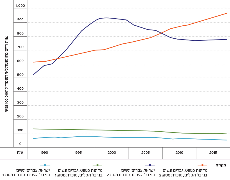 תרשים 7: שיעורי תמותה מסוכרת בישראל בהשוואה למדינות ה-OECD בשנים 2015-1990