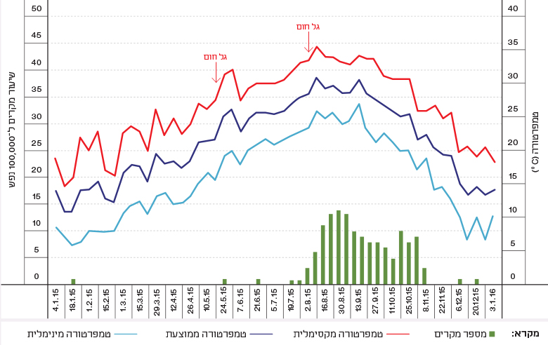 תרשים 8: מספר מקרי תחלואה בקדחת מערב הנילוס בישראל ביחס לטמפרטורות שבועיות מקסימליות, מינימליות וממוצעות בשנת 2015