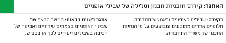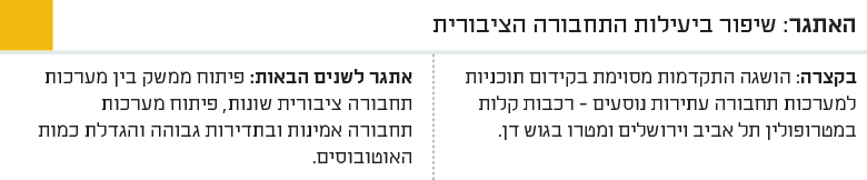 על פי הנתונים המוצגים לעיל, מתחדד הצורך בשיפור יעילות התחבורה הציבורית ובפיתוח הממשק בין מערכות התחבורה הציבורית. בשנים האחרונות מקודם תכנונם של קווי רכבת קלה נוספים בירושלים ובמטרופולין תל אביב. כמו כן מקודמת תעבורת אוטובוסים מהירה (bus rapid transit – BRT), ומוקצים נתיבים ייעודיים לכלי רכב רבי קיבולת ולכלי רכב שבהם שני נוסעים לפחות. לצד שיפור ביעילות בתחבורה הציבורית, יש צורך באגרות גודש ובצמצום תקני חנייה.4