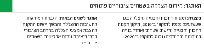 תקנות התכנון והבנייה (הצללה בגן שעשועים) התשע"ט נכנסו לתוקף בספטמבר 2019, והן מחייבות הצללה של 70% מהמרחב החופשי של מתקן בגן שעשועים. בשנת 2020 נכנס לתוקפו שינוי לתקנות התכנון והבנייה (חישוב שטחים ואחוזי בנייה בתוכניות ובהיתרים) התשנ"ב–1992. השינוי נועד לעודד הצבת אמצעי הצללה במרחב הציבורי הפתוח במקומות כגון גן ציבורי, דרך, חוף רחצה, טיילת, כיכר עירונית, מתקני ספורט ונופש, פארק, שביל, שדרה עירונית, שטח ציבורי פתוח או שטח פרטי פתוח שבתוכנית נקבעה בו זכות מעבר לטובת הציבור. ראוי לציין שהתקנה קובעת כי אמצעי ההצללה לא יובאו בחשבון אחוזי הבנייה.