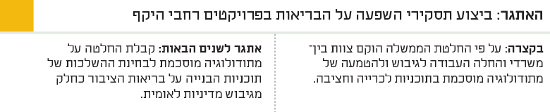 במאי 2018 החליטה הממשלה על הקמת צוות בין-משרדי הכולל את משרד הבריאות, משרד האוצר (מינהל התכנון), המשרד להגנת הסביבה, משרד האנרגייה ומשרד התחבורה. מטרת הצוות לגבש ולהטמיע מתודולוגיה לבחינת היבטים בריאותיים בתוכניות לכרייה וחציבה.8 עמדת משרד הבריאות היא שבכל תוכנית להקמת מיזמי תשתית לאומיים, כגון תחנות כוח, שדות תעופה ומחצבות, תחול על מוסד התכנון החובה לבצע תסקיר השפעה על הבריאות.