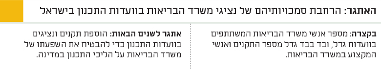 מאז 2017 נוספו במשרד הבריאות שני תקנים מקצועיים בנושא תכנון, ותרומת המשרד להליכי התכנון בכל המישורים התרחבה גם היא. עם זאת, בכמה ממוסדות התכנון הארציים, נציגי משרד הבריאות משמשים ממלאי מקום או משקיפים, והם אינם בעלי זכות הצבעה. על כן יכולתם להוביל ולהשפיע בתחום מדיניות התכנון מוגבלת.