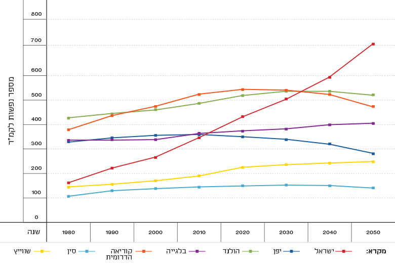 תרשים 1: מגמות צפיפות בישראל ובמדינות נבחרות ותחזית לשנים הבאות