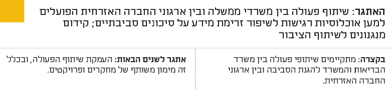 שיתוף הפעולה בין משרד הבריאות לקרן לבריאות וסביבה בא לידי ביטוי בפרויקטים מחקריים משותפים הרלוונטיים, בין היתר, לאוכלוסיות רגישות, לדוגמה מימון משותף של התוכנית הלאומית לניטור ביולוגי, העוסקת גם בחשיפות של ילדים, בעקבות זכיית משרד הבריאות בקול קורא מטעם הקרן לבריאות וסביבה (ראו בפרק "ניטור ביולוגי"). שיתוף פעולה אחר של הקרן לבריאות וסביבה עם המועצה לשלום הילד מתמקד בקידום הצעת חקיקה להגנה על תינוקות, פעוטות וילדים מפני כימיקלים במוצרי צריכה (ראו בפרק "כימיקלים במוצרי צריכה").