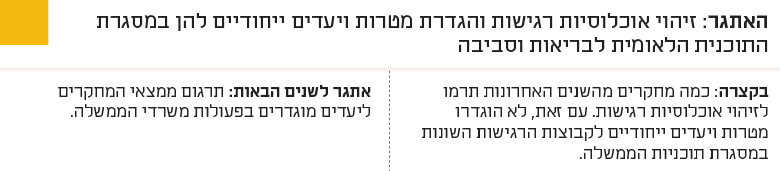 בדוח בריאות וסביבה בישראל 2017 הוגדרו אתגרים לקידום התחום של אוכלוסיות רגישות. להלן סקירת ההתקדמות בשלוש השנים האחרונות.