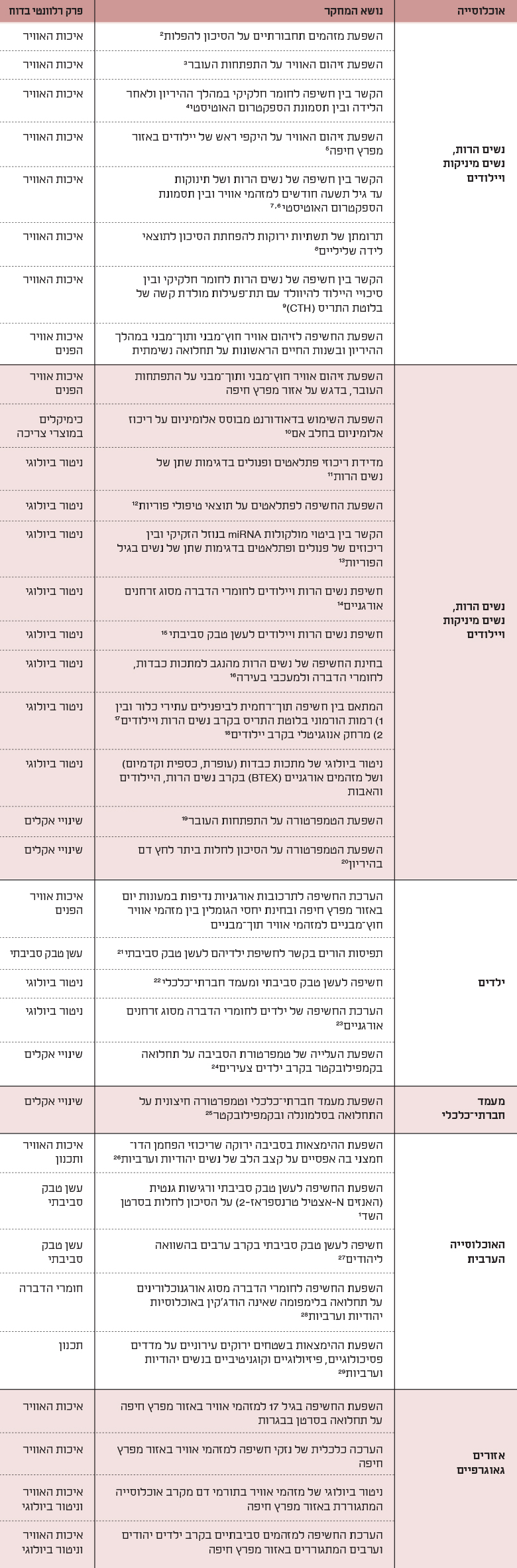 לוח 1: פירוט המחקרים על אוכלוסיות רגישות בישראל בתחום בריאות וסביבה, 2020-2017